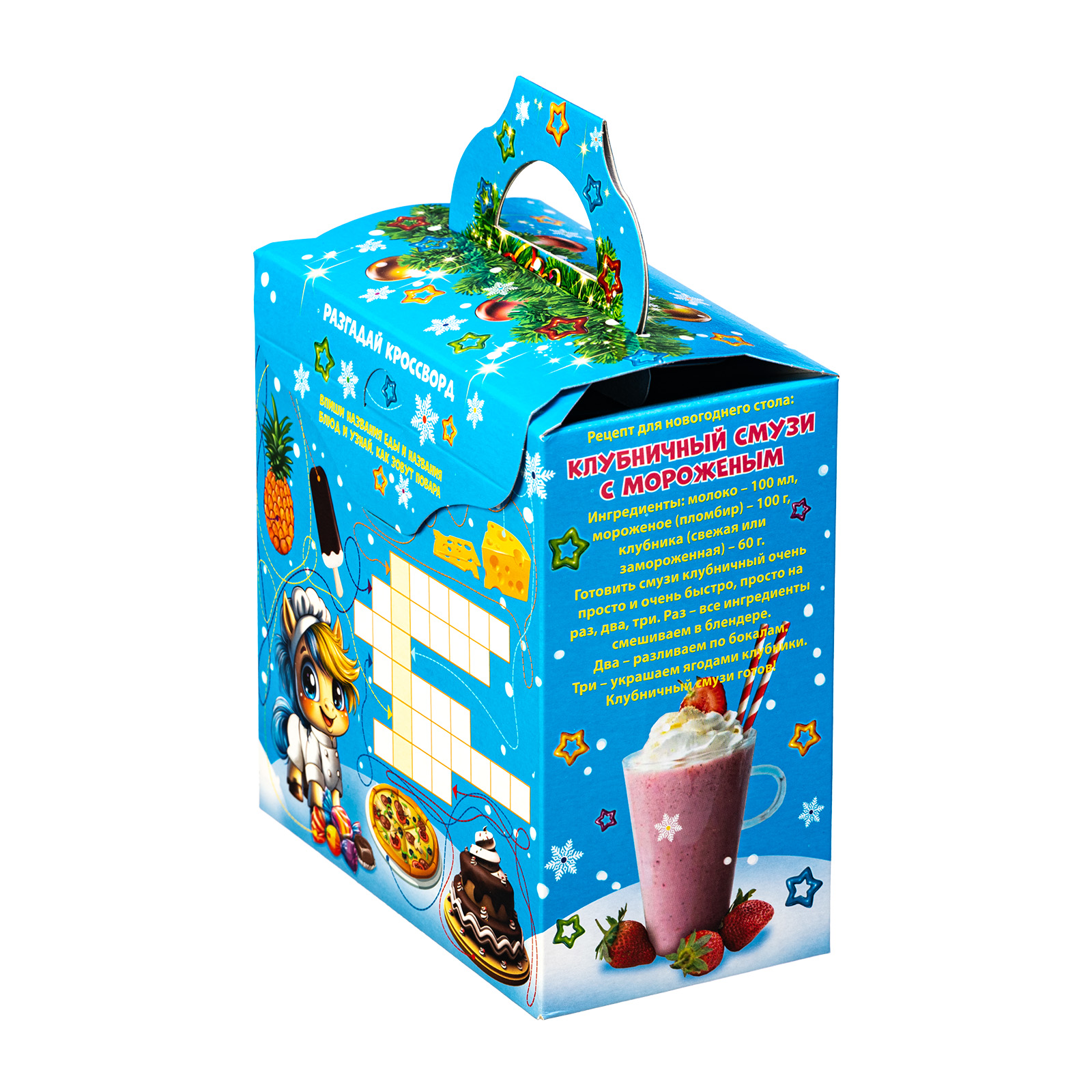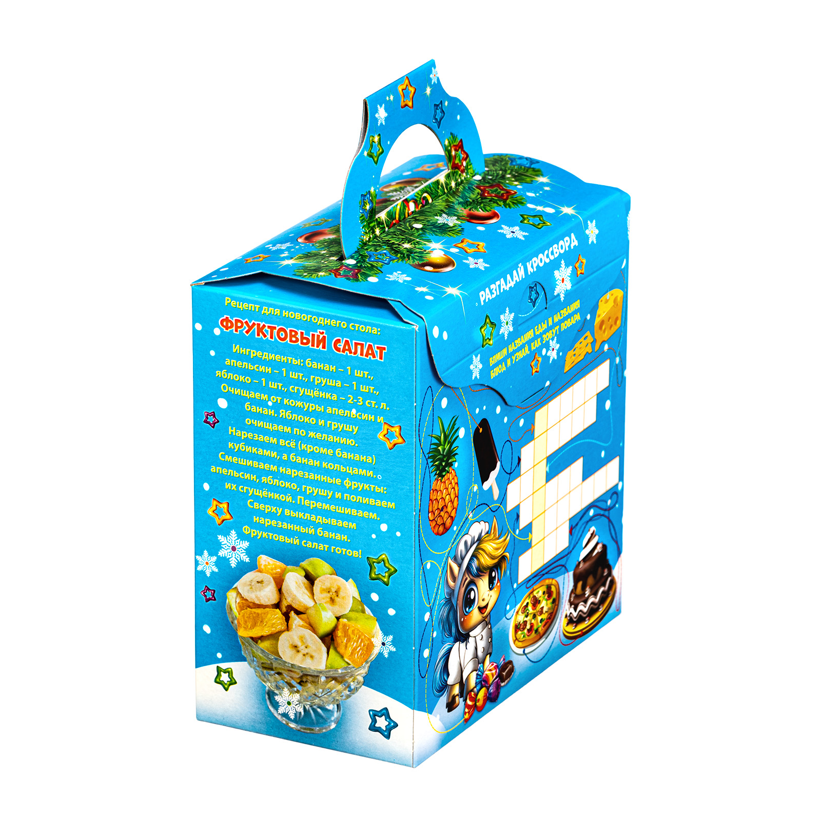 Ищете новогодний сладкий подарок для праздника в детском саду? Обратите внимание на набор “Поваренок Гоша”. За счет небольших размеров и грамотно подобранного конфетного состава этот подарок идеально подойдет для деток дошкольного возраста. Это коробочка нежно голубого цвета, со всех сторон украшенная разнообразными фигурными снежинками. На фронтальной части набора есть довольно милый рисунок: маленький очаровательной жеребенок в поварском кителе, который изучает книгу рецептов. Справа на упаковке как раз напечатан один из рецептов этой волшебной книги - обязательно приготовьте этот салат на новогодних праздниках!