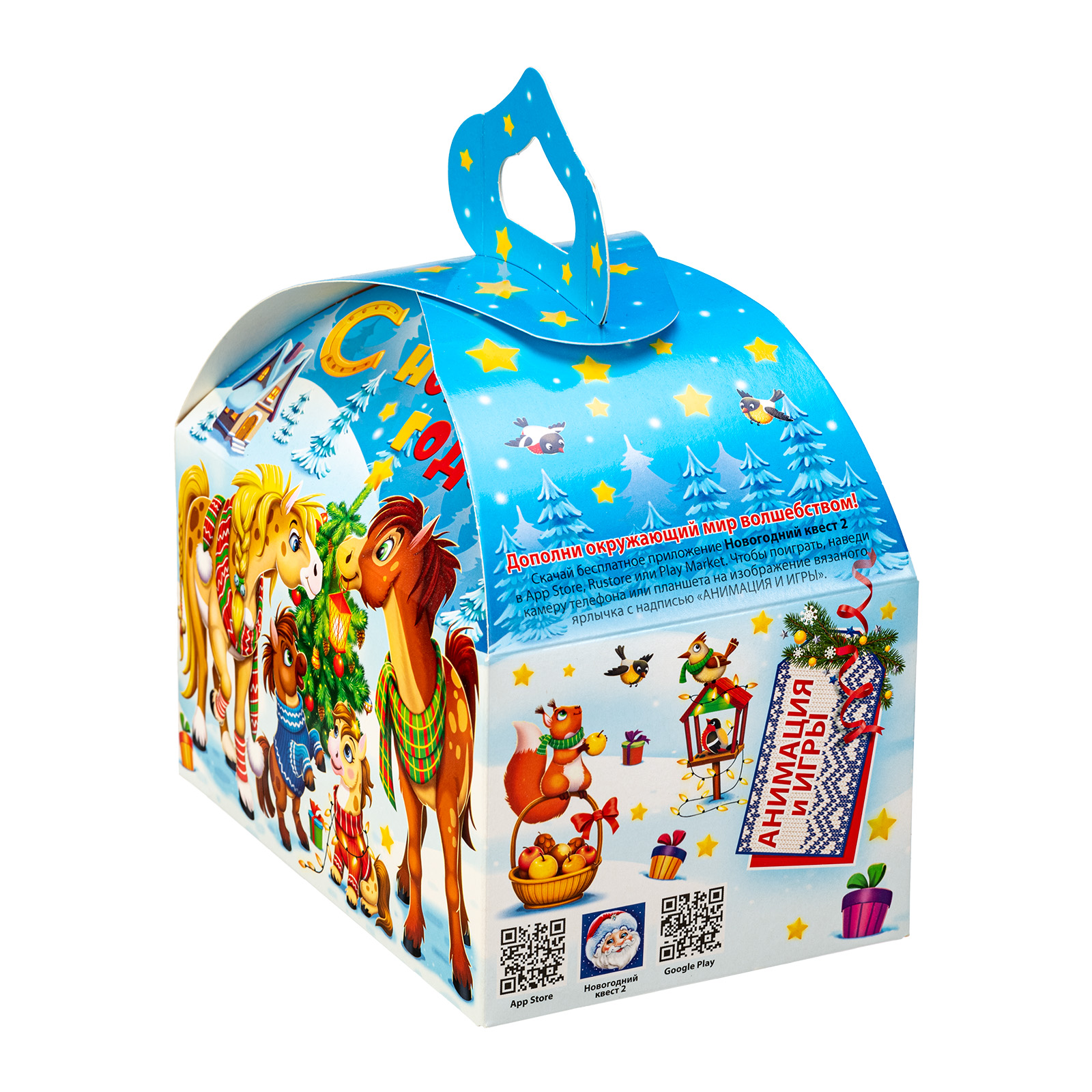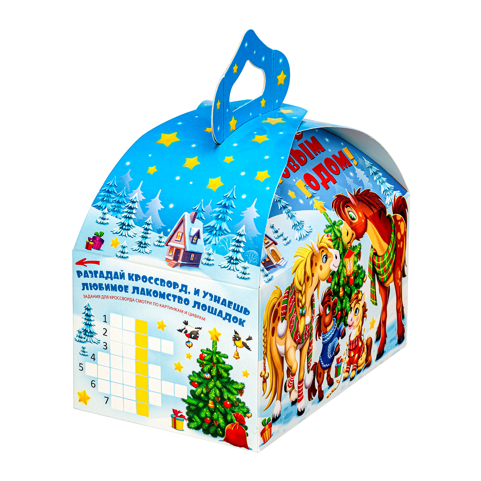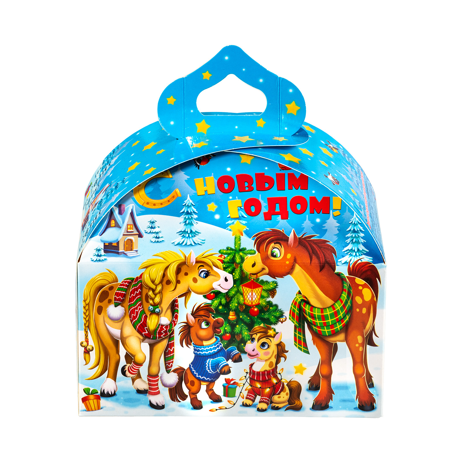 Новогодние сладкие подарки в картонной упаковке - это универсальный вариант для сластены любого возраста. Килограмм разнообразных сладостей и небольшой памятный сувенир помещены в привлекательную упаковку. По форме она напоминает самый настоящий сказочный ларец с удобной ручкой необычной формы. Со всех сторон упаковка украшена яркими разнообразными иллюстрациями на которых изображена веселая семейка лошадок, готовящихся встречать наступающий волшебный праздник. Подарочный набор подойдет как для праздника в детском учреждении, так и для поздравления сотрудников на новогоднем корпоративе.